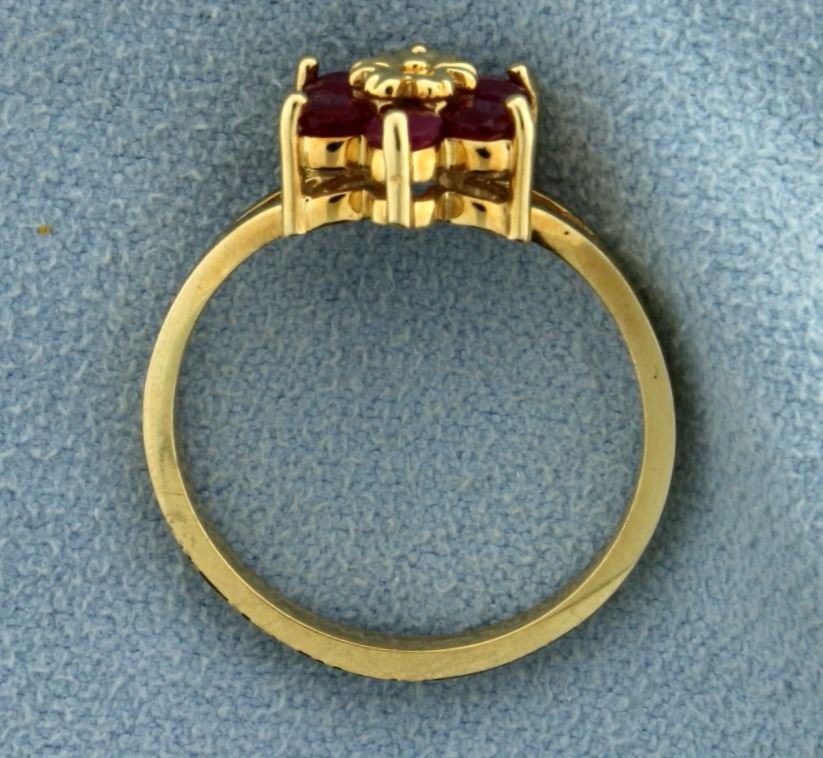 In 14k yellow gold, containing six 2.5mm round natural ruby gemstones with great color and clarity. Size 7 1/4. 2.8g.