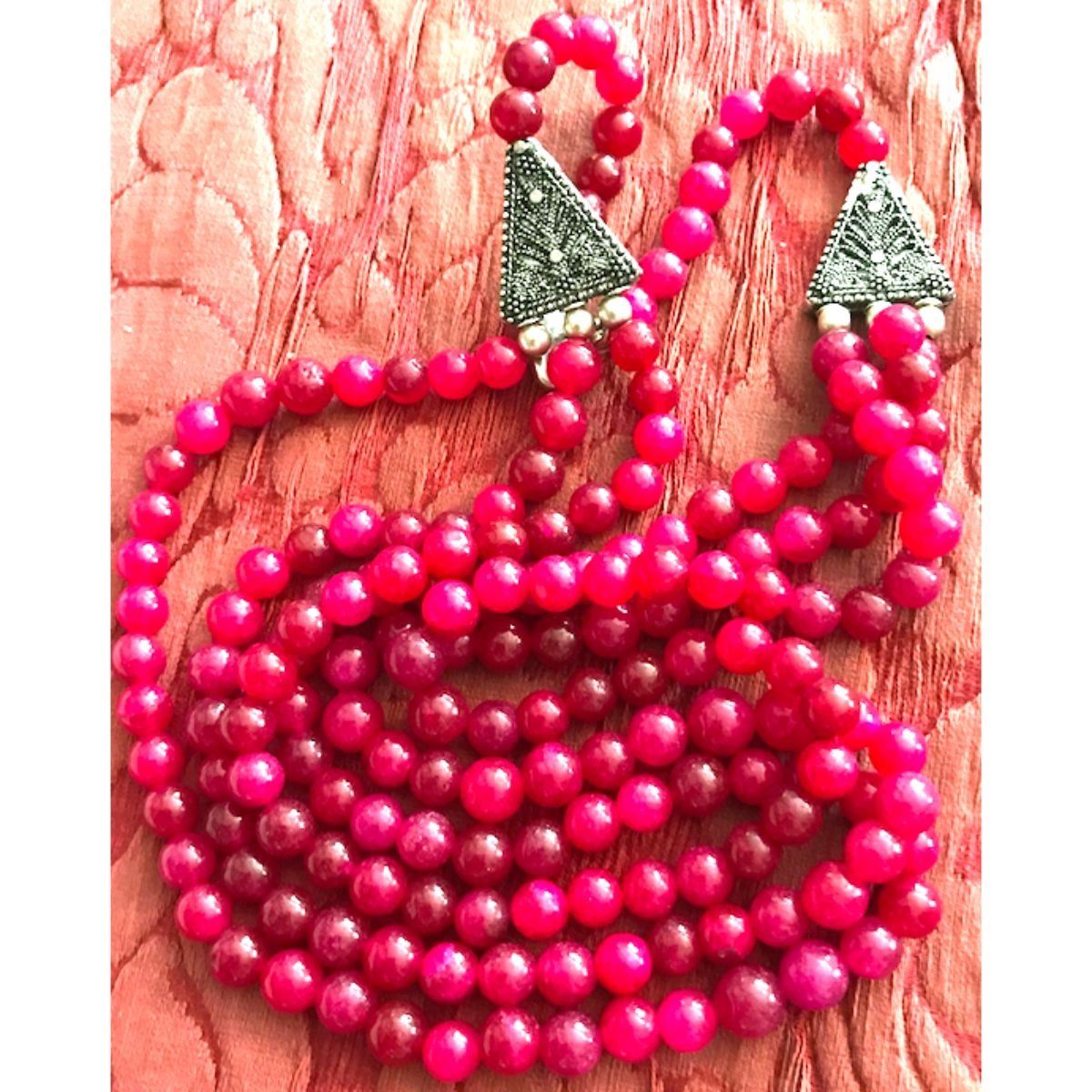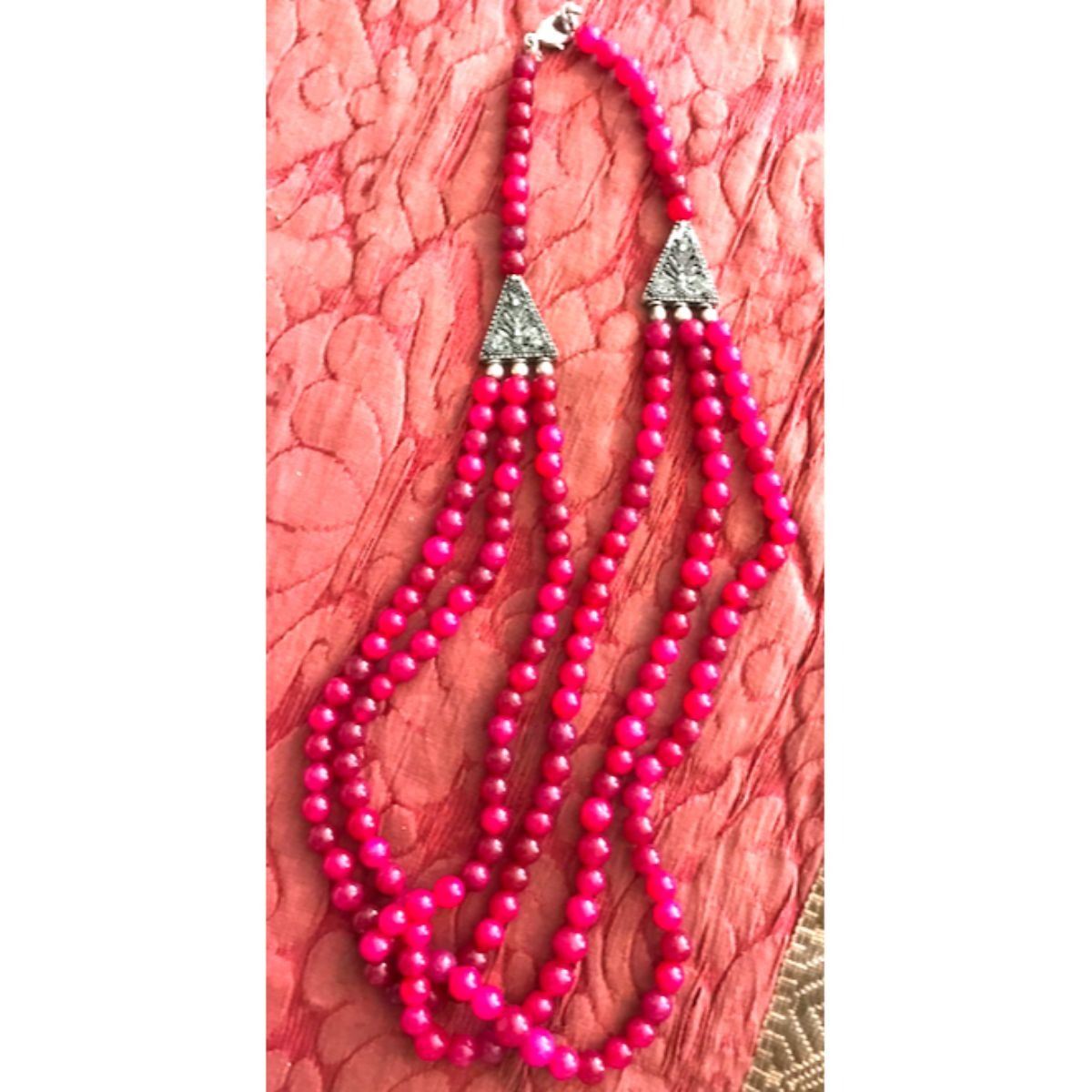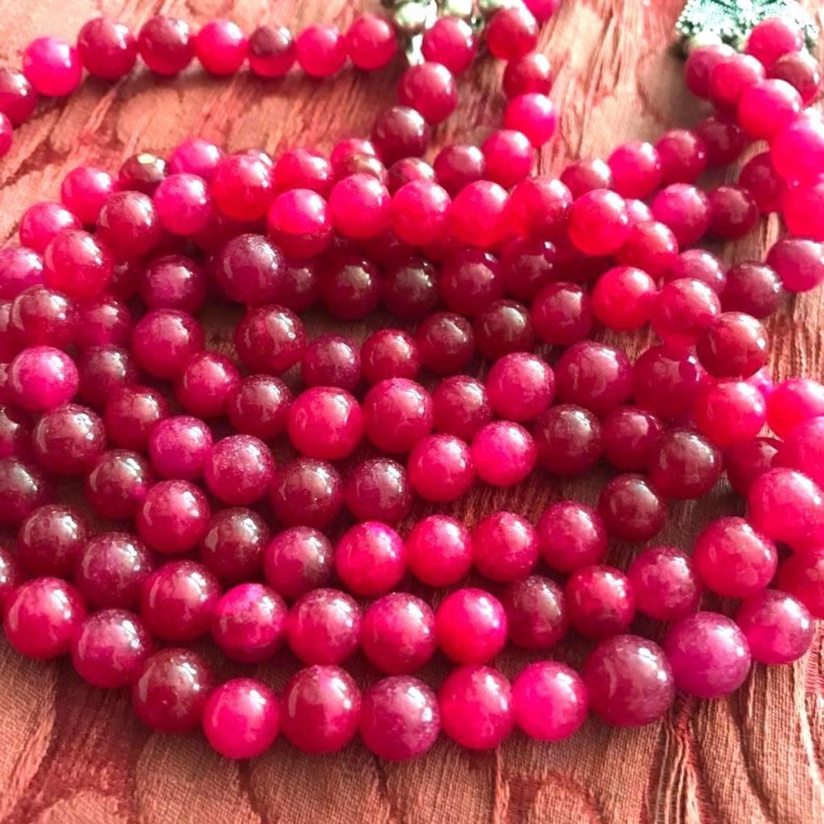 171 natural round ruby gemstone beads ( 6mm size ), dark pink to dark burgundy color, triple strand necklace with silver accent beads. 17 - 21" necklace.Â