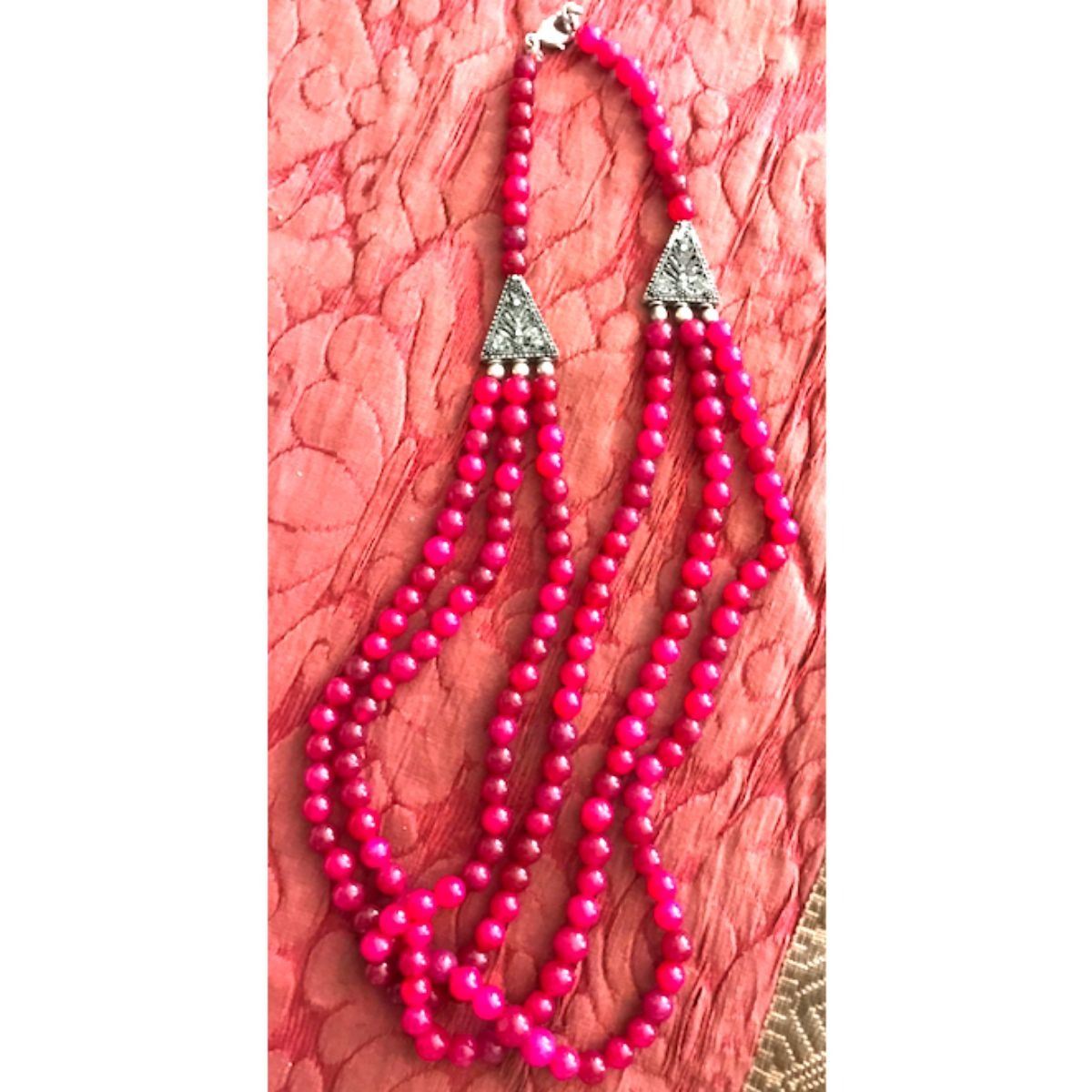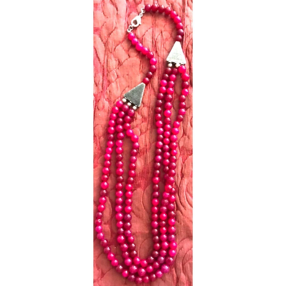 171 natural round ruby gemstone beads ( 6mm size ), dark pink to dark burgundy color, triple strand necklace with silver tone accent beads. 17 - 21" necklace.Â