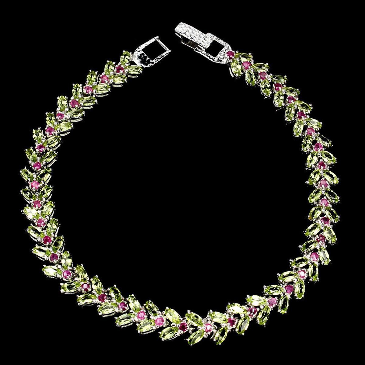 925 STERLING SILVER;PLATE14K WHITE GOLD;LENGTH (INCHES)8;MAIN STONERUBY;OTHER GEMSPERIDOT;TOTAL WEIGHT74.49 CT (TOTAL WEIGHT OF SILVER + STONE)DIMENSION* STONE 2.0 TO 4.0 X 2.0 MM. * FACE BRACELET 185.0 X 8.0 MM.;MAIN STONE SHAPEROUND CUT;MAIN STONE COLORTOP RICH RED PINK;CLARITY/GRADETRANSPARENT;LUSTERGORGEOUS;ORIGINMOZAMBIQUE;HARDNESS6.5 - 9.0;