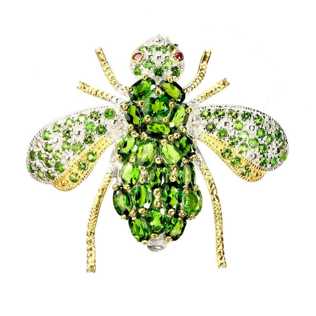 925 STERLING SILVER;PLATE-2-TONE WHITE & YELLOW 14K GOLD;MAIN STONE-CHROME DIOPSIDE;OTHER GEMS-RUBYTOTAL WEIGHT61.64 CT (TOTAL WEIGHT OF SILVER + STONE)DIMENSION* STONE 1.5 TO 5.0 X 3.0 MM. * FACE BROOCH 46.0 X 42.0 MM.MAIN STONE SHAPE-OVAL CUT;MAIN STONE COLOR-TOP RICH GREEN;CLARITY/GRADE-IF TO VVS;LUSTER-DELUXE;TREATMENT-UNHEATED;ORIGIN-RUSSIA;HARDNESS-5.0 - 5.5;