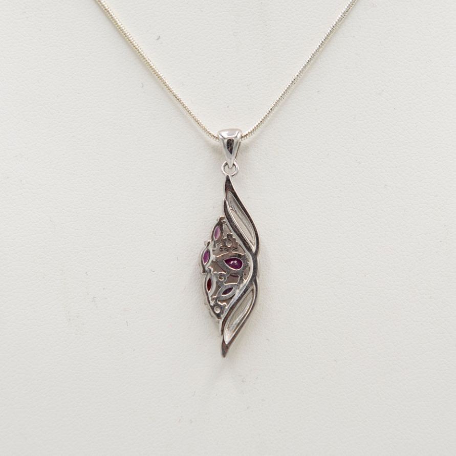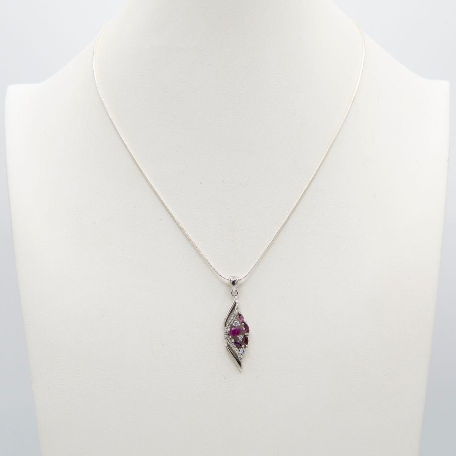 Extremely Pretty Natural Ruby Pendant. Fine faceted marquis cut. Vivid pinkish red hue and complimented by sparkling cz accent stones .Mounted in elaborately designed solid .925 stamped sterling silver. Pendant total gram wt is approx. 3.1 grams. Includes an 18 "chain.7.4 total gram wt or 37 ctttw with chain.