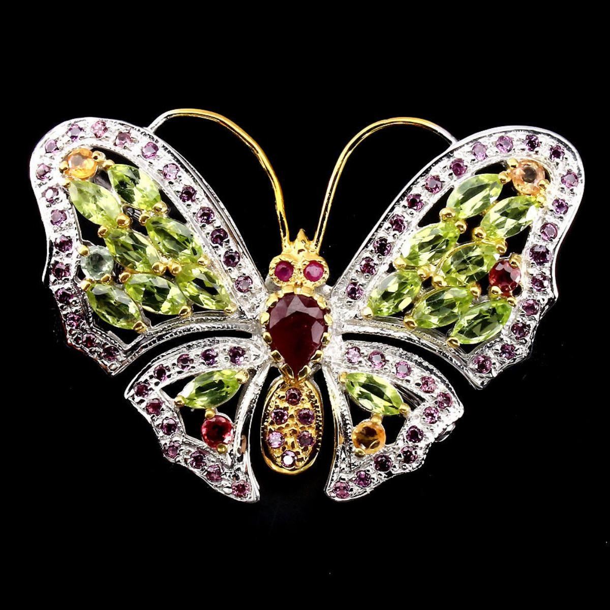 925 STERLING SILVERPLATE-2-TONE WHITE & YELLOW 14K GOLD;MAIN STONERUBYOTHER GEMSPERIDOT,RHODOLITE GARNET,RUBY,SAPPHIRETOTAL WEIGHT71.30 CT (TOTAL WEIGHT OF SILVER + STONE)DIMENSION* STONE 1.0 TO 8.0 X 6.0 MM. * FACE BROOCH 49.0 X 36.0 MM.MAIN STONE SHAPEPEAR CUTMAIN STONE COLORTOP BLOOD REDCLARITY/GRADETRANSPARENTLUSTEREXQUISITEORIGINMADAGASCARHARDNESS6.5 - 9.0