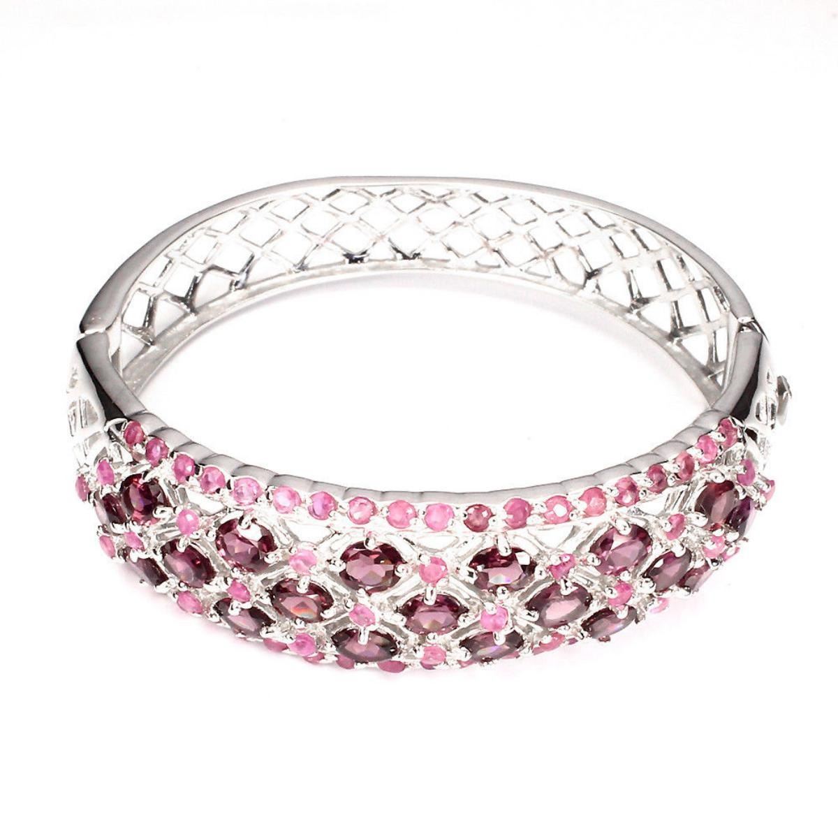 925 STERLING SILVER...... PLATE 14K WHITE GOLD; LENGTH (INCHES) 2; MAIN STONE RHODOLITE GARNET OTHER GEMS RUBY TOTAL WEIGHT 128.94 CT (TOTAL WEIGHT OF SILVER + STONE) DIMENSION * STONE 2.0 TO 5.0 X 4.0 MM. * DIAMETER 2.0 INCHES. * FACE BANGLE 62.0 X 16.0 MM. MAIN STONE SHAPE OVAL CUT MAIN STONE COLOR TOP RICH PINK RASPBERRY CLARITY/GRADE IF TO VVS LUSTER SUBLIME TREATMENT UNHEATED ORIGIN AFRICA HARDNESS 7.0 - 7.5