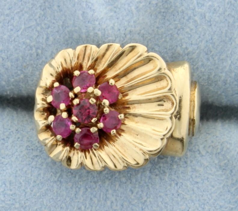 In 14K yellow gold it contains one 3mm and six 2.5mm natural rubies with great color! Size 4 7.8g