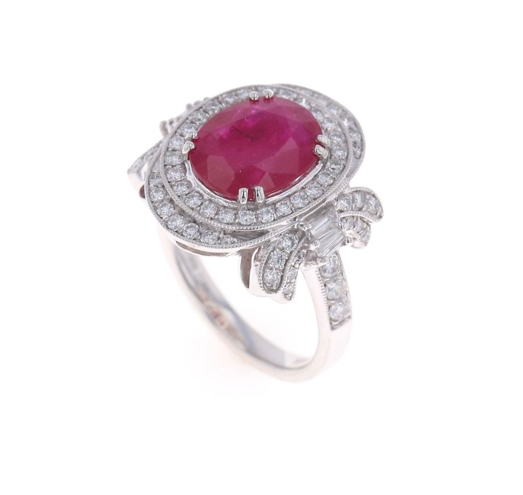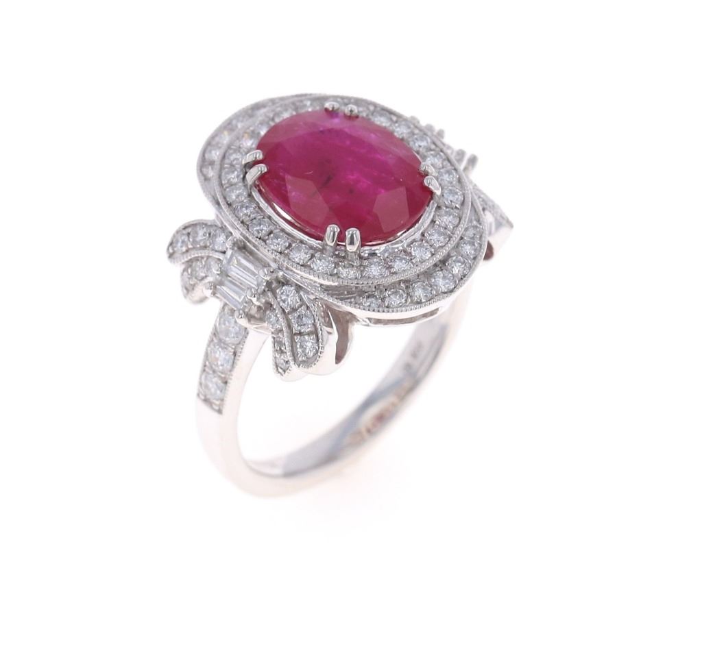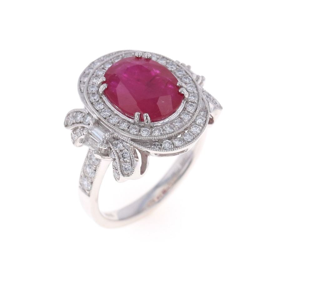 Featured in this lot natural ruby VS1 diamond and platinum ring with AIGL paperwork. The Ring features a polished, stamped and tested platinum ring with a bright finish and shows a 'Orianne' hallmark with a 'PT950' stamp next to the hallmark. The center stone is a oval brilliant cut crown natural ruby with a step cut pavilion and measures 10.7 x 8.5mm and a total weight of 3.37 carats and a red coloration and a very good cut grade. The center stone and the ribbon decoration are profusely decorated with a total of 74 round brilliant and baguette diamonds with measurements for the roud brilliant diamonds 1.1 - 2.0mm and the baguette 2.5 - 3.0mm with a total diamond weight of 0.92 carats and a clarity of VS1 - SI1 and a color gradient of F - G. The piece comes complete with AIGL Inc.(American International Gemological Laboratories, Inc. a GIA certified lab AIGL#: K58E85-EA16858) report and appraisal confirming the above info and giving a total value of $16,110.00. The ring size is US 7.