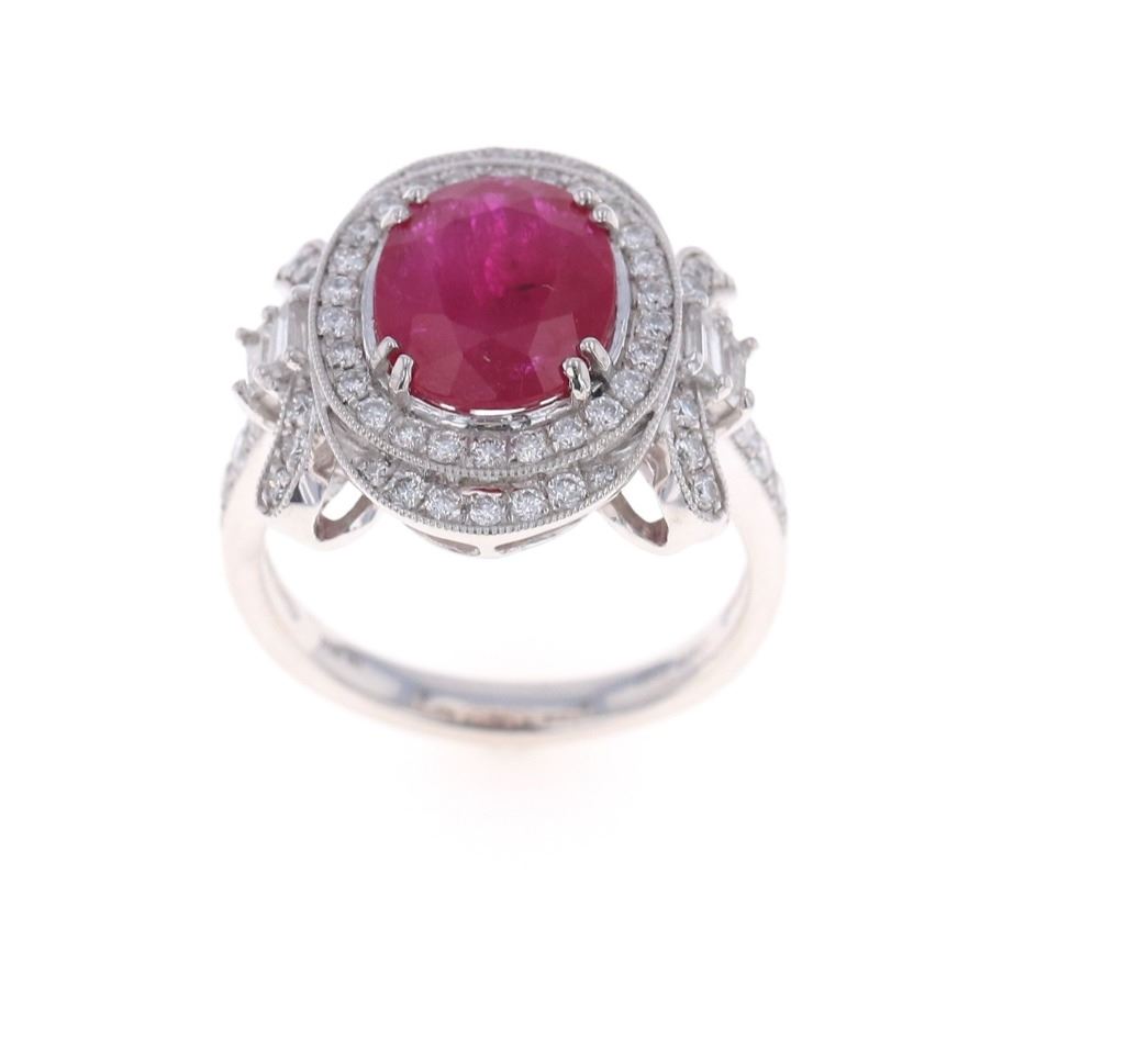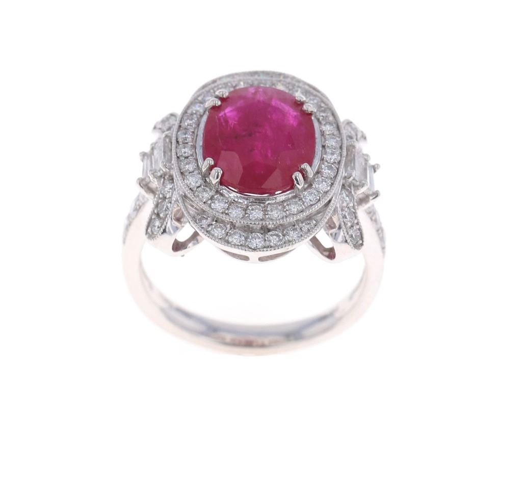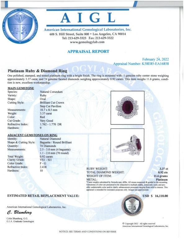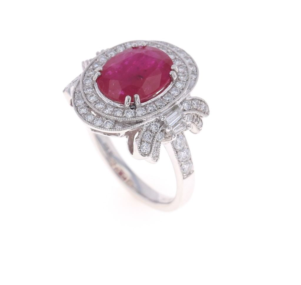 Featured in this lot natural ruby VS1 diamond and platinum ring with AIGL paperwork. The Ring features a polished, stamped and tested platinum ring with a bright finish and shows a 'Orianne' hallmark with a 'PT950' stamp next to the hallmark. The center stone is a oval brilliant cut crown natural ruby with a step cut pavilion and measures 10.7 x 8.5mm and a total weight of 3.37 carats and a red coloration and a very good cut grade. The center stone and the ribbon decoration are profusely decorated with a total of 74 round brilliant and baguette diamonds with measurements for the roud brilliant diamonds 1.1 - 2.0mm and the baguette 2.5 - 3.0mm with a total diamond weight of 0.92 carats and a clarity of VS1 - SI1 and a color gradient of F - G. The piece comes complete with AIGL Inc.(American International Gemological Laboratories, Inc. a GIA certified lab AIGL#: K58E85-EA16858) report and appraisal confirming the above info and giving a total value of $16,110.00. The ring size is US 7.