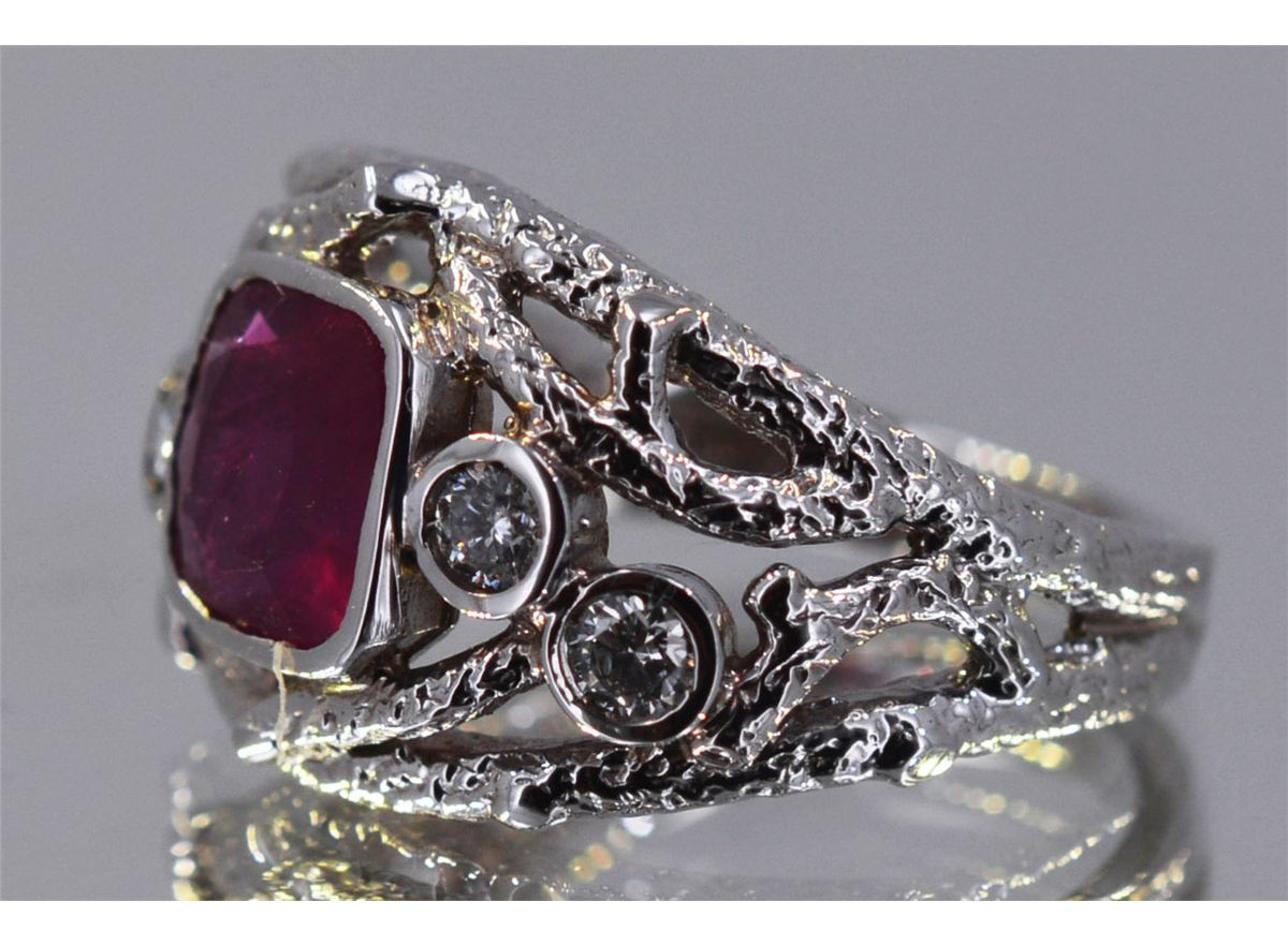 14kt White Gold 6.88 Approx grams including, 2.00ct Cushion Cut Ruby (no lead) Deep Red color, .22cttw Round Diamond G-H color VS-SI clarity