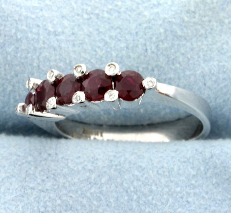 Fantastic Ruby & Diamond band in 14k white gold. The 5 round Natural High Quality Rubies total approximately 1 carat TW and have a beautiful vibrant ruby red color. Band also contain ten, 1/2 pt high quality diamonds. Size 7 1/4 3.9g