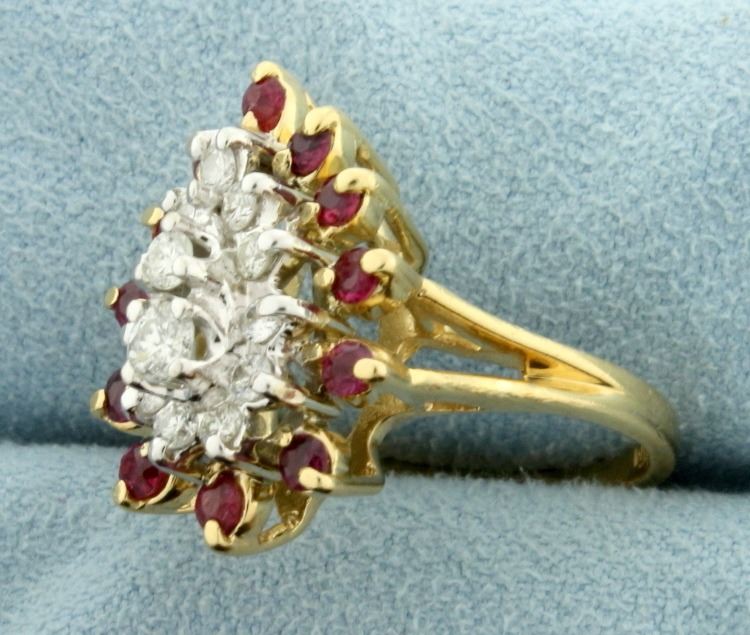 In 14K Yellow Gold. Contains 1/2ct TW of high quality round brilliant Diamonds ranging from .03 to .12cts each, SI clarity/F color. Also contains twelve high quality 2mm natural Rubies with bright color and excellent clarity. Size 6 1/2. 6.6g