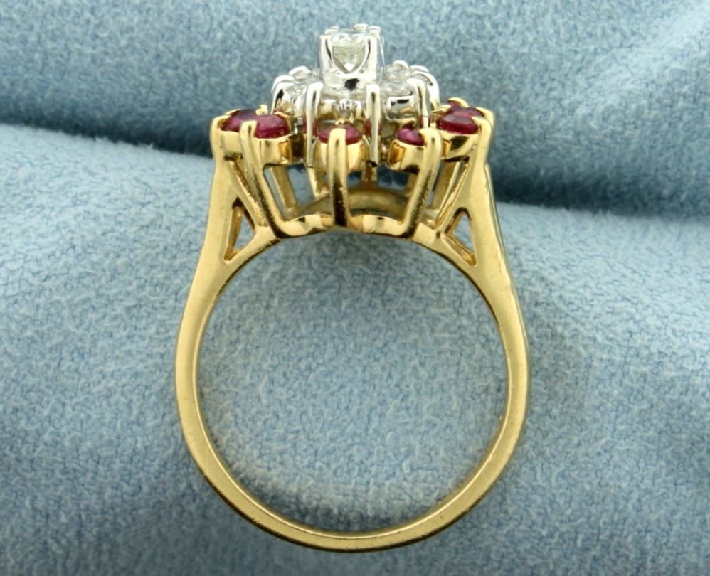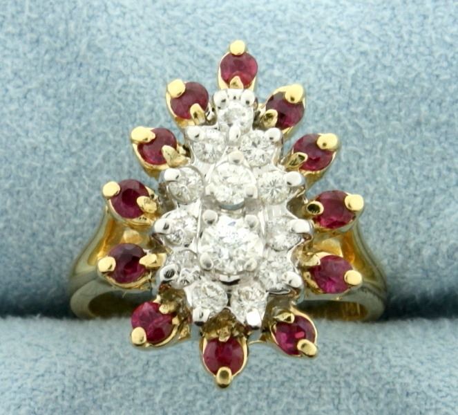 In 14K Yellow Gold. Contains 1/2ct TW of high quality round brilliant Diamonds ranging from .03 to .12cts each, SI clarity/F color. Also contains twelve high quality 2mm natural Rubies with bright color and excellent clarity. Size 6 1/2. 6.6g
