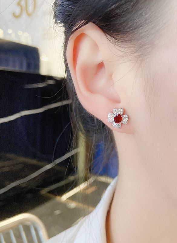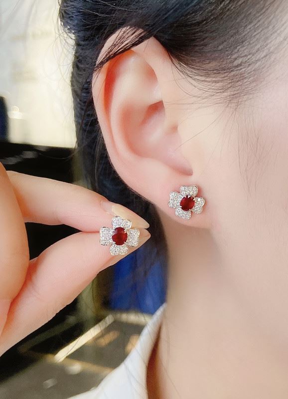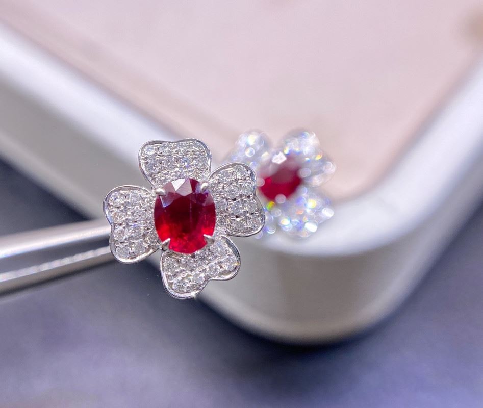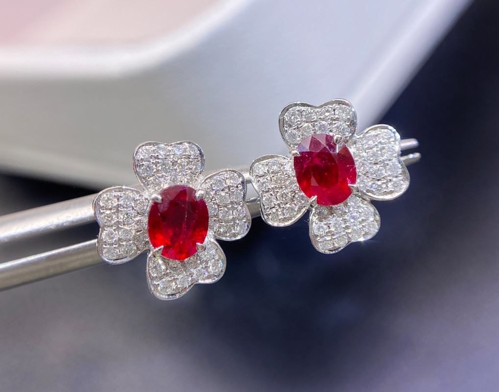 These earrings feature natural rubies as the centerpiece, surrounded by sparkling diamonds arranged in a four-leaf clover shape, symbolizing luck and happiness. Each ruby radiates a deep red glow, perfectly complemented by the brilliance of the diamonds, creating an elegant and luxurious visual effect. Whether for daily wear or special occasions, these earrings bring luck and charm to the wearer.Main stone: 0.85ct, side stones: 0.33ct. Note: Comes with an AGL certificate and a domestic jewelry identification certificate.