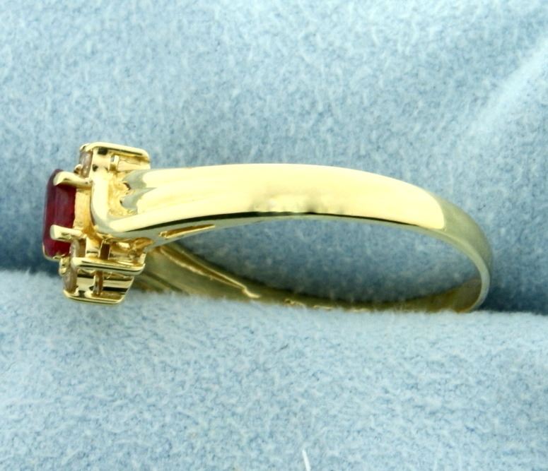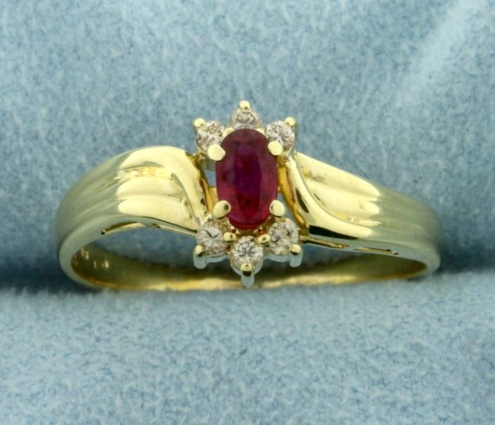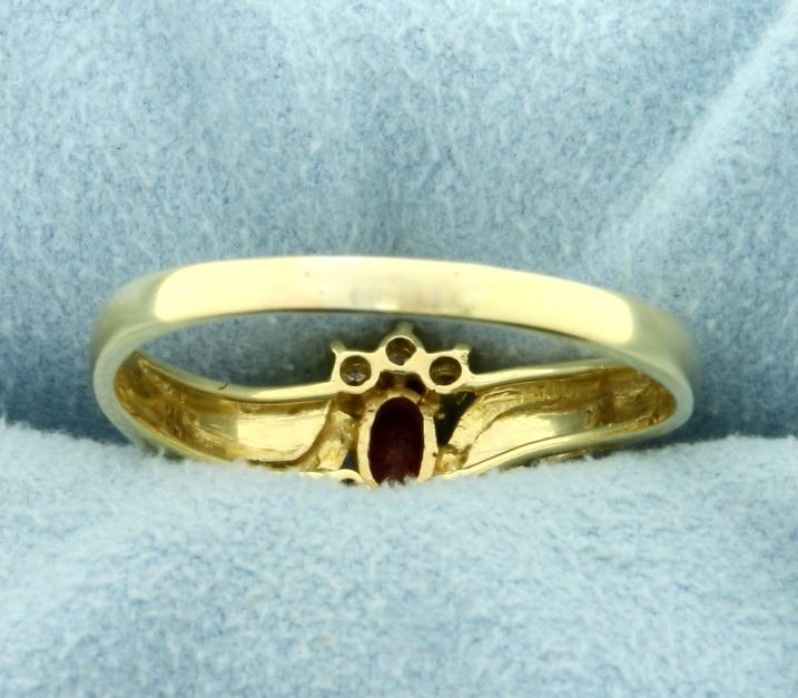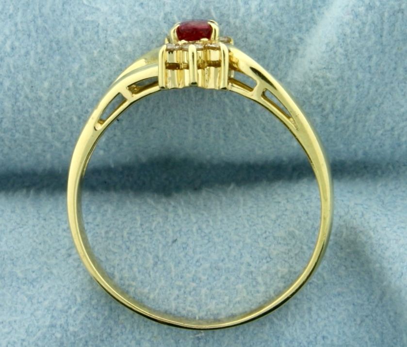 In 14K Yellow Gold. Contains a natural very high quality 5x3mm Ruby gemstone with beautiful ruby red color and excellent clarity. Also contains six .02ct high quality Diamonds, VS clarity/H color. Size 10 1/2. 3.5g