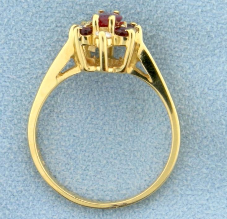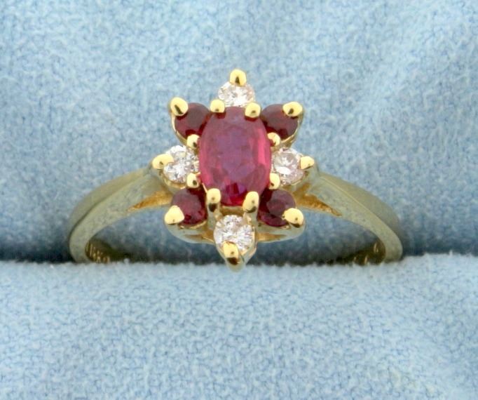 In 14k yellow gold.  The ring contains a 6mm x 4mm high quality natural ruby that weighs 1/2 carat and 4 round Rubies that weigh 1/4 ct TW.  The rubies are of excellent clarity and have a beautiful deep red color.  Also contains 4 high quality brilliant cut diamonds total 0.16 carats, SI clarity and G color.  Size 7 1/2  3.2g
