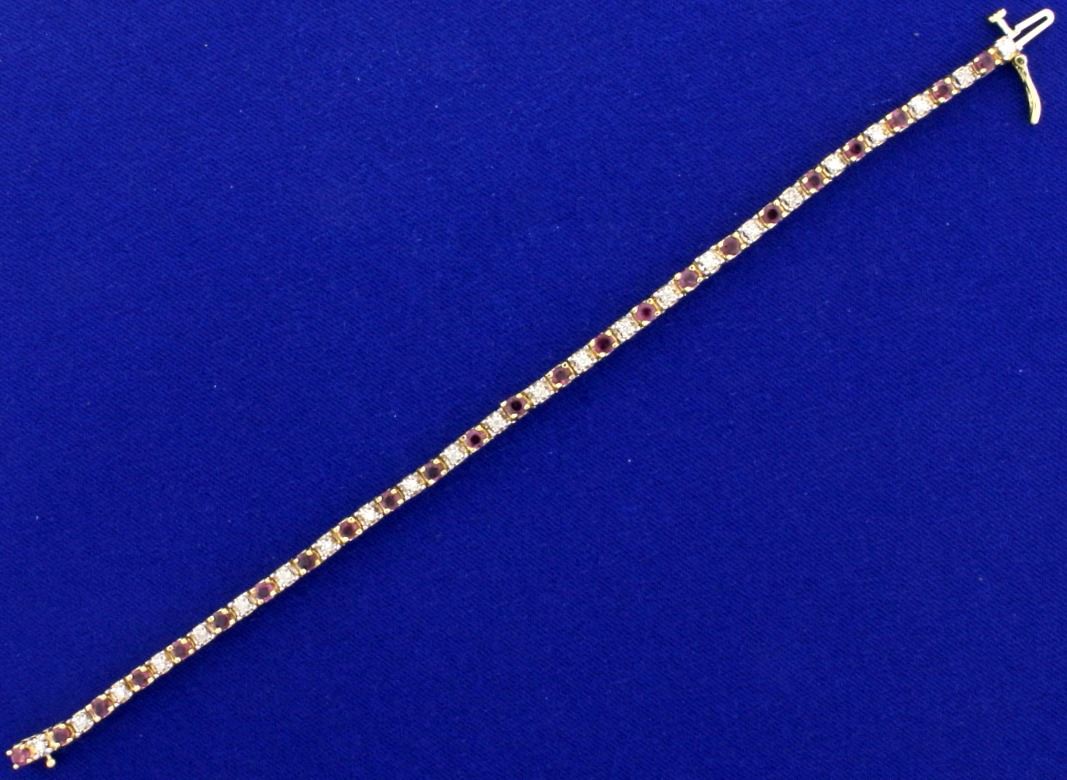 In 14k yellow and white gold, containing 1/2ct TW of high quality diamonds of H color/I clarity. Also contains 2cts of high quality round natural rubies with safety clasp. 7 inches long. 9.9g.