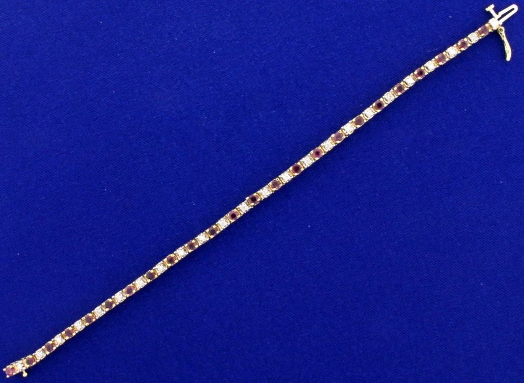 In 14k yellow and white gold, containing 1/2ct TW of high quality diamonds of H color/I clarity. Also contains 2cts of high quality round natural rubies with safety clasp. 7 inches long. 9.9g.
