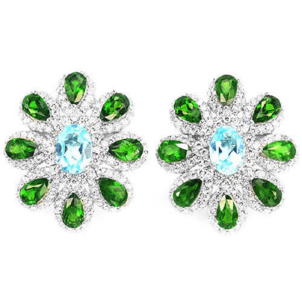 REAL SKY BLUE TOPAZ CHROME DIOPSIDE CZ 925SILVER EARRING 14K WHITE GOLD COATING; STONE SHAPE OVAL & PEAR PORTUGUESE CUT STONE DIMENSION 7 X 5 MM. & 5 X 3 MM. ITEM WEIGHT 9.7 GRAM COLOR SKY BLUE & GREEN CLARITY VVS - VS LUSTER DAZZLING TREATMENT IRRADIATION & UNHEATED ORIGIN OF STONE AFRICA & RUSSIA HARDNESS 5.0 - 8.0 ; FACE OF EARRING 23 X 21 MM. WHITE CUBIC ZIRCONIA 1.5 MM. & 1 MM.