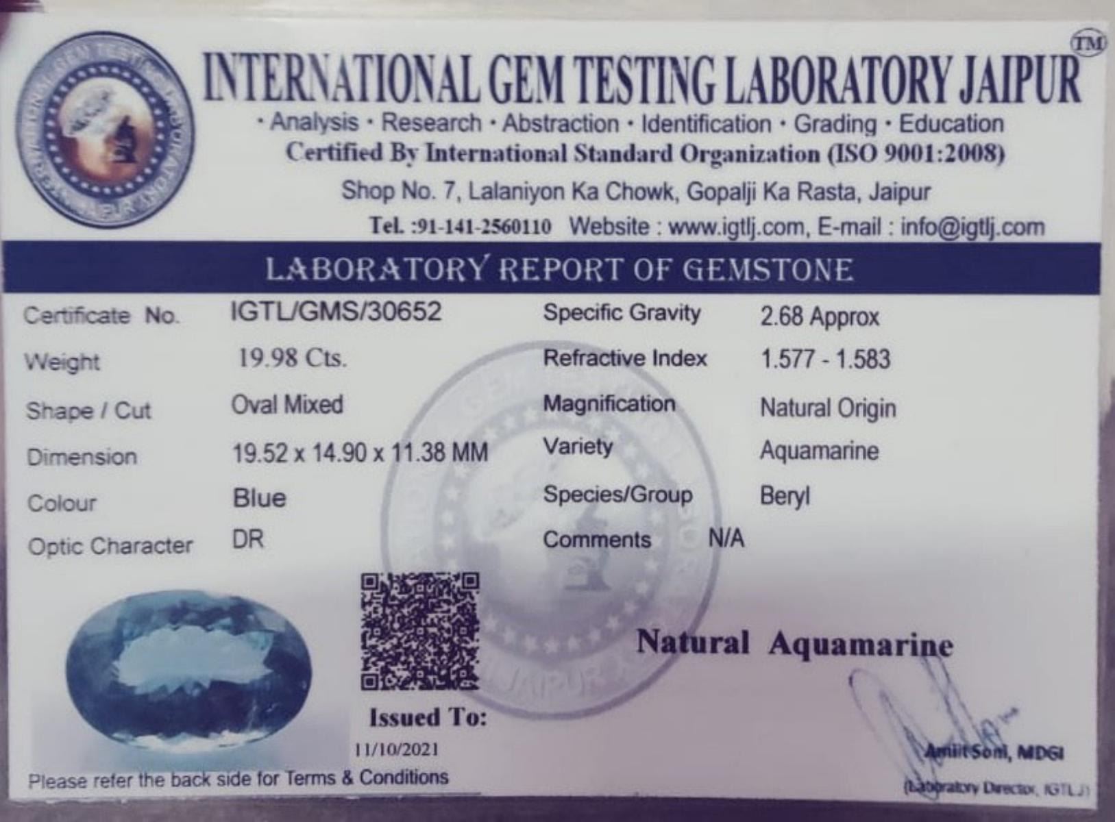 Natural Aquamarine; WEIGHT : 19.98 cts; SHAPE : oval Cut; SIZE ( L x W x D ) : 19.52 x 14.9 x 11.38 mm; QUANTITY : 1 piece; COLOR : Aqua Blue; CLARITY : VS/ 100% Eye Clean; ORIGIN : Brazil; HARDNESS : 8; LUSTER : Best AAA Fire!!! TREATMENT : UNHeated 100% NATURAL; Certified
