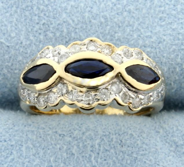 In 14k yellow gold. Contains 3 marquise natural sapphires, 6mm long with excellent vibrant blue color and clarity. Also contains 1/2 ct TW of high quality diamonds, I color/I clarity. Size 5.5. 4.6g