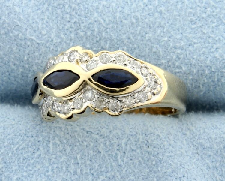 In 14k yellow gold. Contains 3 marquise natural sapphires, 6mm long with excellent vibrant blue color and clarity. Also contains 1/2 ct TW of high quality diamonds, I color/I clarity. Size 5.5. 4.6g