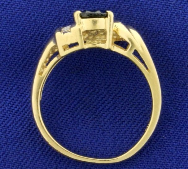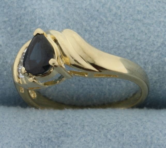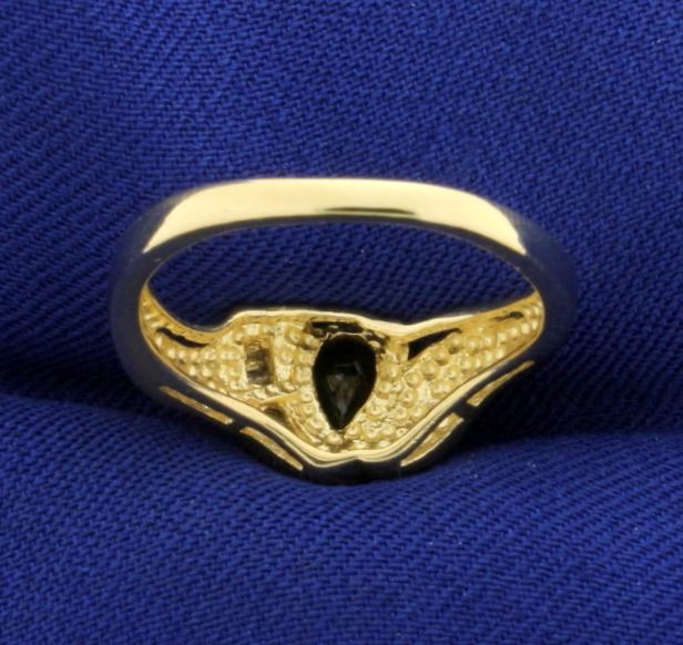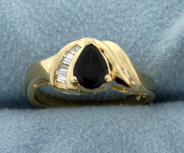 In 14k yellow gold. Contains a natural 7x5mm pear shaped sapphire gemstone with deep blue color and excellent clarity. Also contains seven high quality .01ct baguette diamonds, SI clarity/G color. Size 6 3/4. 3.8g.