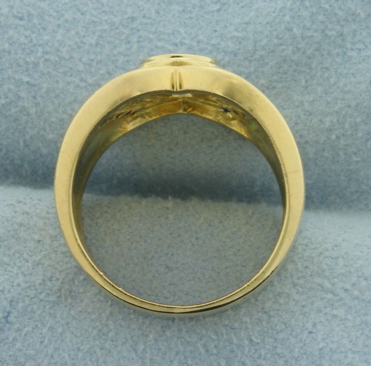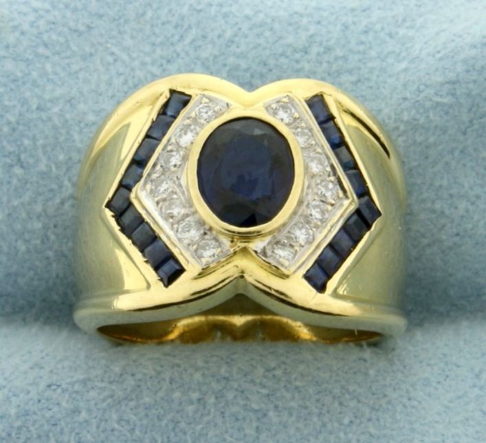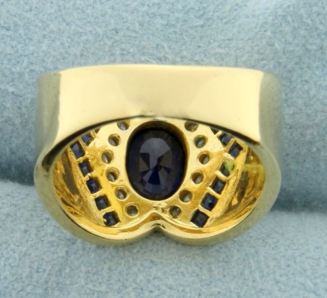 In 18k yellow gold. Contains a 1ct high quality natural sapphire AAA quality with vivid blue color and excellent clarity. Surrounded by eighteen 2mm square sapphires of similar quality and fourteen high quality .02ct diamonds of VS clarity/F color. Size 6
