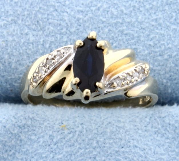 In 14k yellow gold. The beautiful .75 ct Marquise sapphire is 8mm x 4mm, 0.75 carat approx. weight, with a deep blue color and good clarity. There are eight .01ct high quality diamonds set next to the sapphire. Size 6. 3.0g