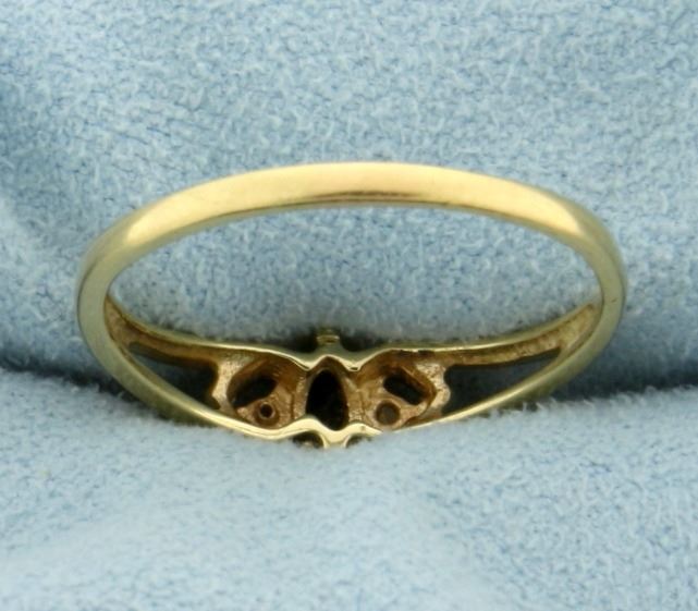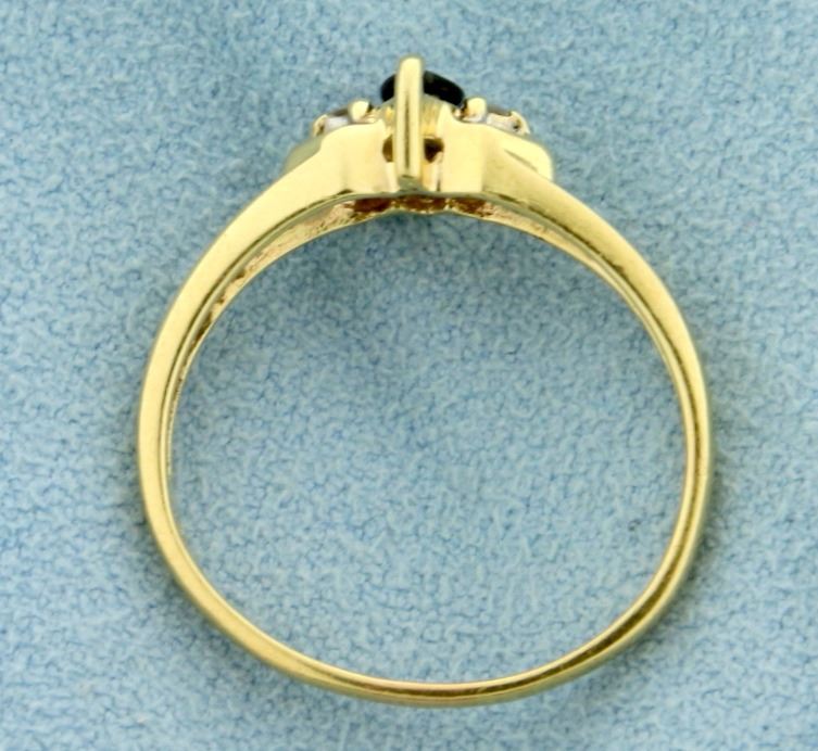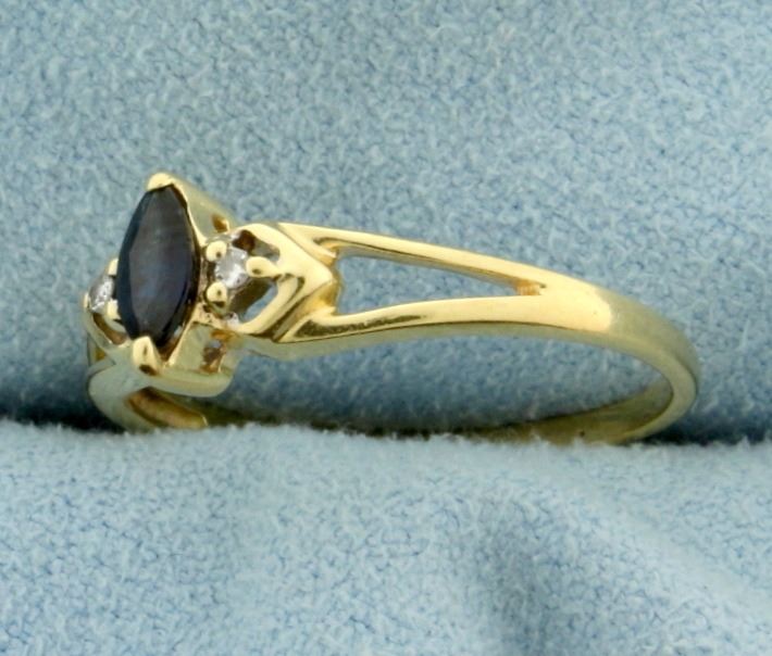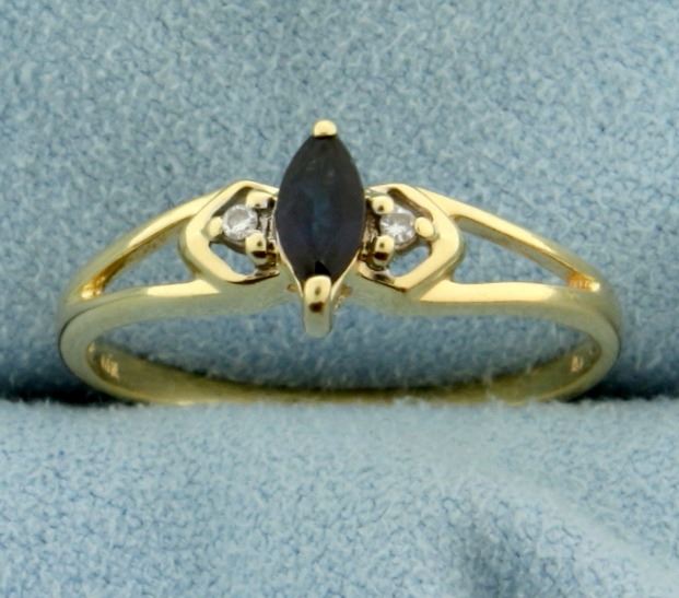 In 14k yellow gold. Contains a natural 1/4ct marquise sapphire with a .01ct high quality diamonds on each side. Size 7. 1.9g.