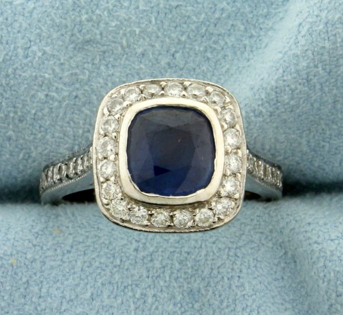 In 14k white gold. Contains a 2ct square high quality natural sapphire with a deep blue color and excellent clarity. Also contains .85ct TW of .02ct to .05ct high quality diamonds with a VS clarity/H color. Stability balls on inside shank. Size 5. 7.3g.