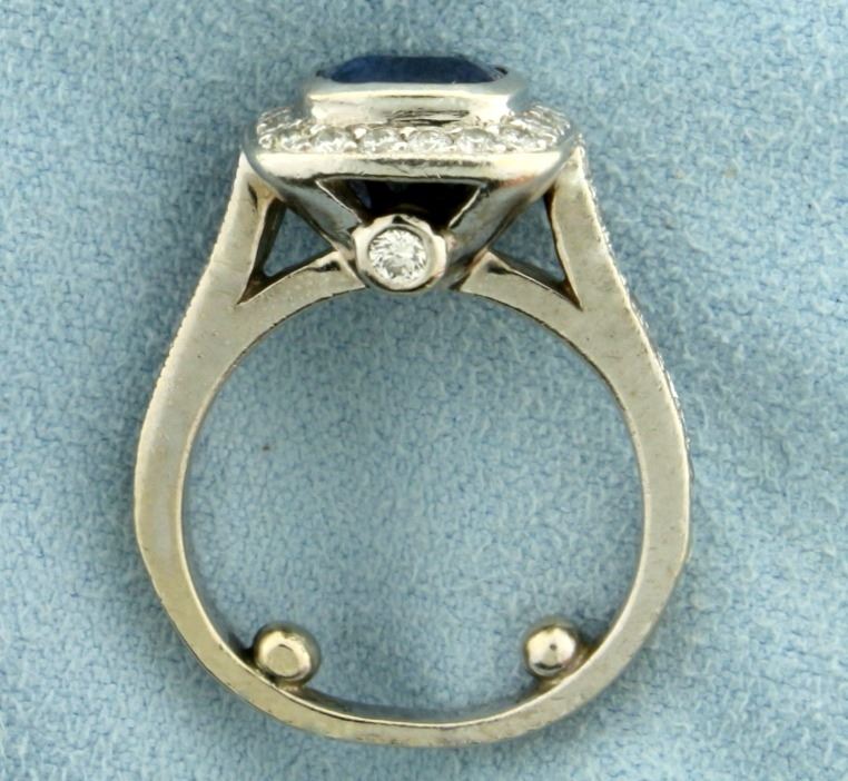 In 14k white gold. Contains a 2ct square high quality natural sapphire with a deep blue color and excellent clarity. Also contains .85ct TW of .02ct to .05ct high quality diamonds with a VS clarity/H color. Stability balls on inside shank. Size 5. 7.3g.