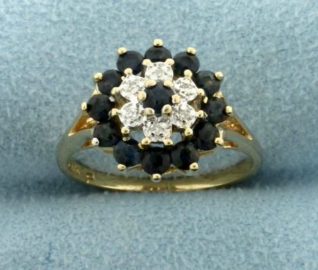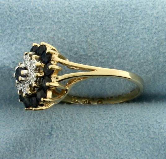 In 10k yellow gold. Contains thirteen high quality natural 2.5mm deep blue colored sapphires and six high quality .01ct diamonds. Size 6. 2.9g.