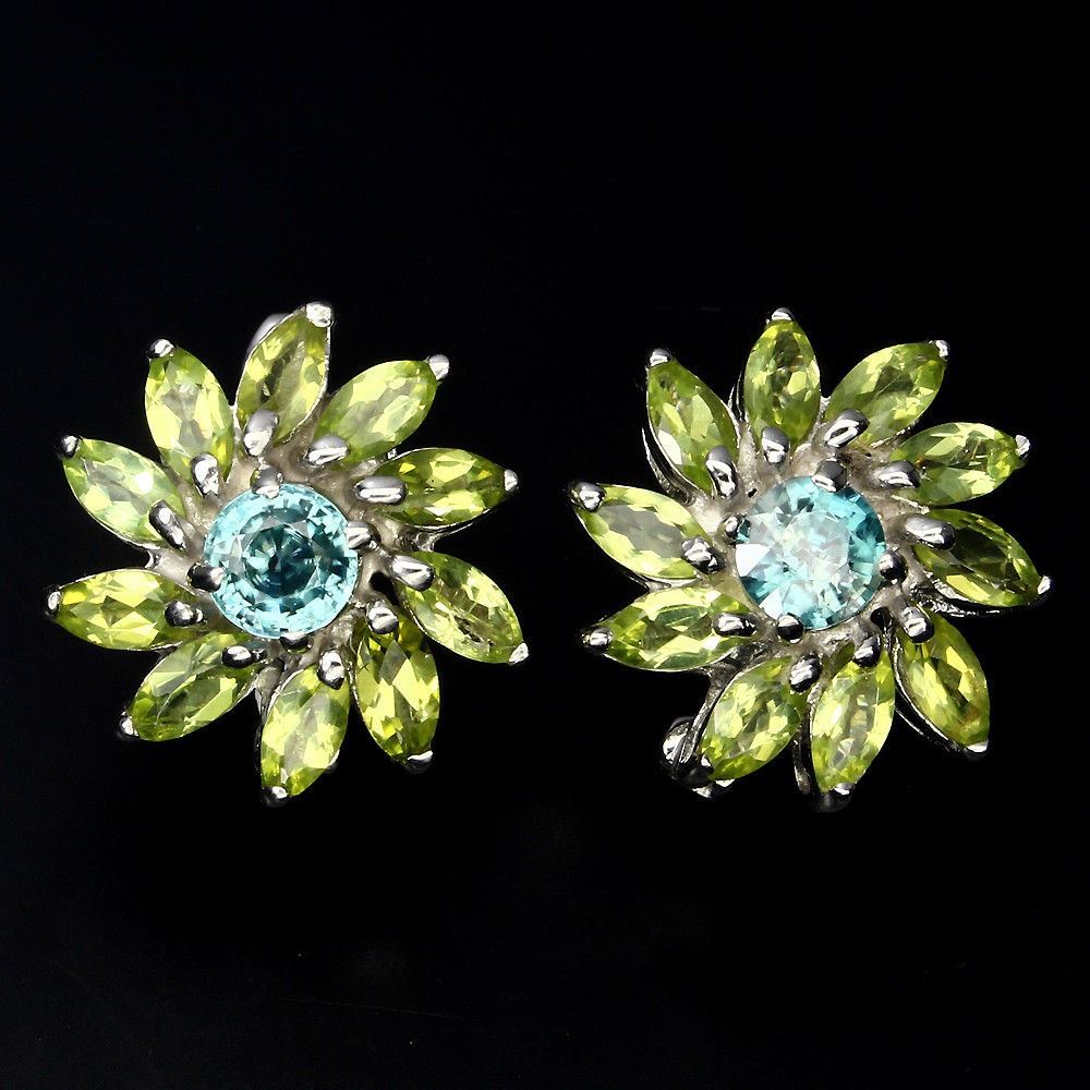 925 STERLING SILVER; 14K WHITE GOLD plated; MAIN STONE -ZIRCON; OTHER GEMS -PERIDOT; TOTAL WEIGHT 56.45 CT (TOTAL WEIGHT OF SILVER + STONE) DIMENSION * STONE 6.0 X 3.0 TO 6.0 MM. * FACE EARRINGS 19.0 MM. MAIN STONE SHAPE ROUND CUT MAIN STONE COLOR TOP SEAFOAM BLUE CLARITY/GRADE IF TO VVS LUSTER SUBLIME ORIGIN -CAMBODIA, Pakistan; HARDNESS -6.5 - 7.5