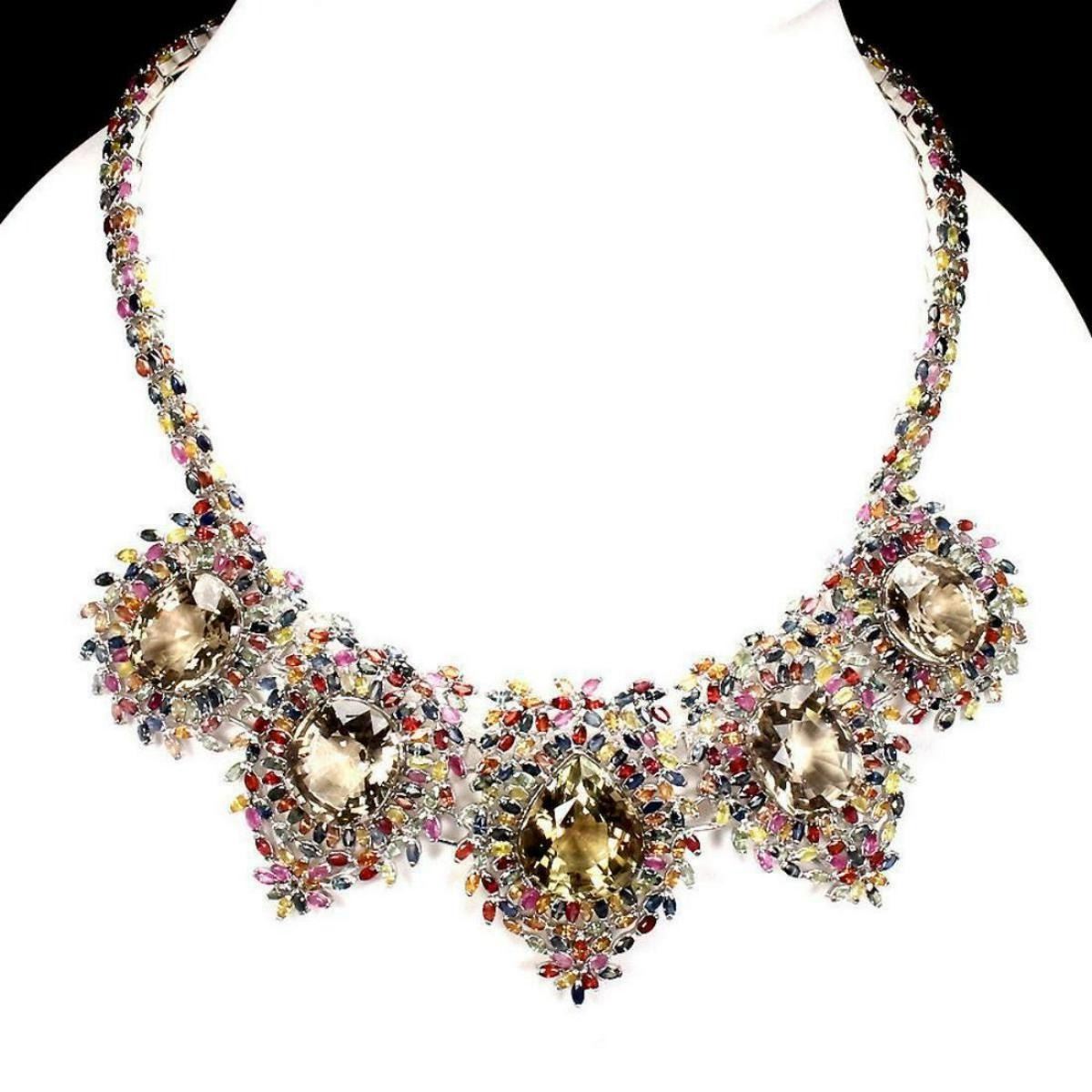 925 STERLING SILVER;PLATE14K WHITE GOLD;LENGTH (INCHES)17.5;MAIN STONESMOKY QUARTZ;OTHER GEMSRUBY,SAPPHIRE;TOTAL WEIGHT675.27 CT (TOTAL WEIGHT OF SILVER + STONE)DIMENSION* STONE 4.0 X 2.0 TO 23.0 X 19.0 MM. * STONES PART LENGTH 430.0 X 54.0 MM.;MAIN STONE SHAPEPEAR CUT;MAIN STONE COLORTOP SMOKY;CLARITY/GRADEIF;LUSTERGRACIOUS;TREATMENTUNHEATED;ORIGINBRAZIL;