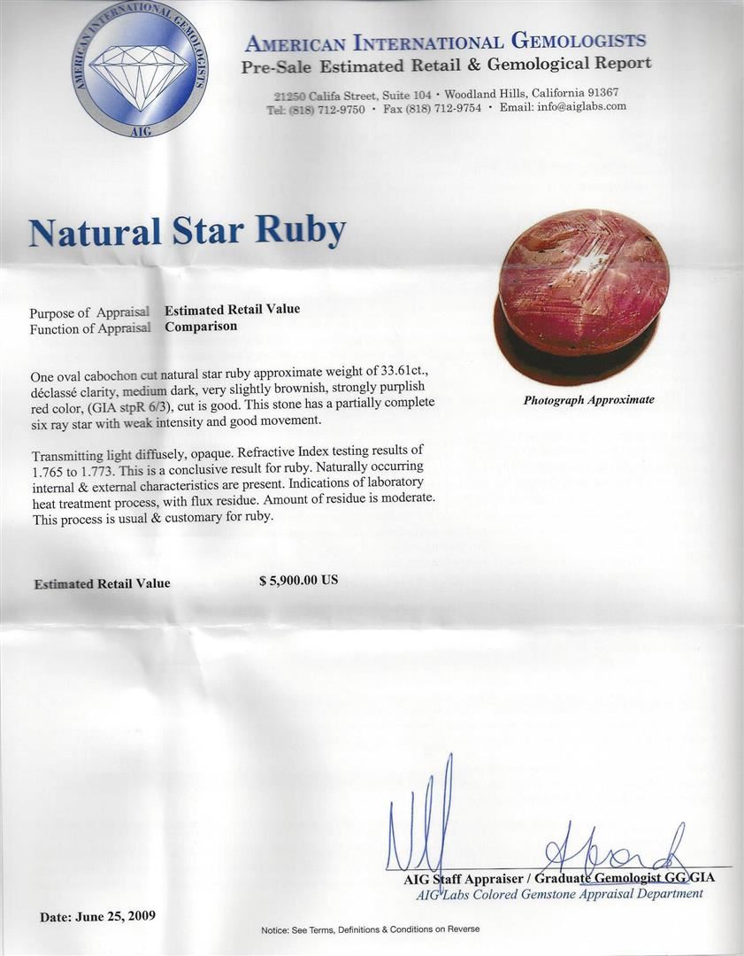 One oval cabochon cut natural star ruby approximate weight of 33.61ct., declasse clarity, medium dark, very slightly brownish, strongly purplish red color, (GIA stpR 6/3), cut is good. This stone has a partially complete six ray star with weak intensity and good movement. Transmitting light diffusely, opaque. Refractive Index testing results of 1.765 to 1.773. This is a conclusive result for ruby. Naturally occurring internal & external characteristics are present. Indications of laboratory heat treatment process, with flux residue. Amount of residue is moderate. This process is usual & customary for ruby. AIG Appraised at $5,900.00.