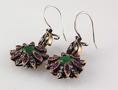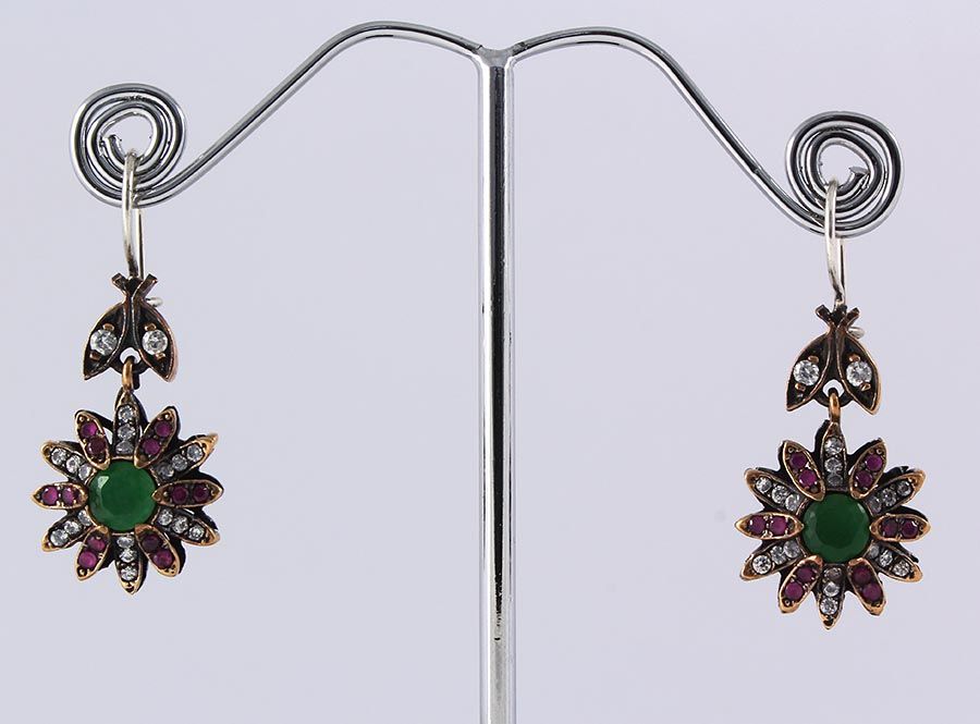 Natural Stone Antique Design Dangle Earring **|**|** 7.24g Natural Stone Ruby & 5.5MM Emerald Beryl Antique Look Earring w/ cz diamonds; stamp 925 ; MSRP: $100