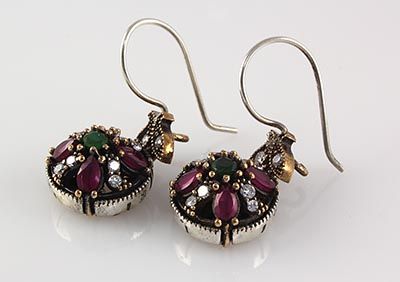 Natural Stone Antique Design Dangle Earring **|**|** 9.24g Natural Stone Ruby and Emerald Beryl Antique Design Dangle Earring; stamp 925 ; MSRP: $100
