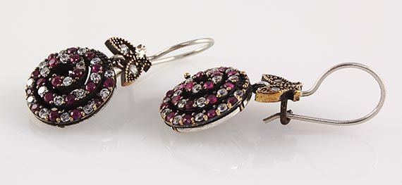 Natural Stone Antique Design Dangle Earring **|**|** 8.57g Natural Stone Ruby Spiral Antique Design Hook Earring w/ cz diamonds; stamp 925 ; MSRP: $100
