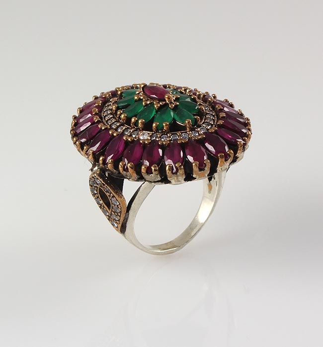 Natural Stone Cocktail Victorian Design Ring **|**|** 16.15g Natural Stone Cocktail Ring Victorian Design Ruby and Emerald Beryl; stamp 925 ; MSRP: $100