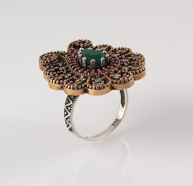 Natural Stone Cocktail Victorian Design Ring **|**|** 10.27g Natural Stone Cocktail Ring Victorian Design w/ 8x6MM Emerald Beryl center; stamp 925 ; MSRP: $100