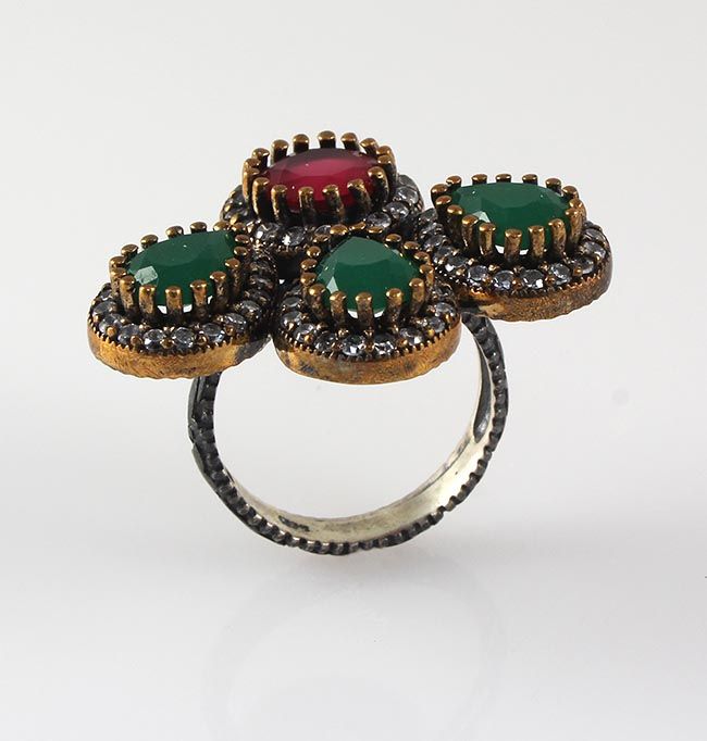 Natural Stone Cocktail Victorian Design Ring **|**|** 8.54g Natural Stone Cocktail Ring Victorian Design w/ 8MM Ruby & 8x6MM Emerald Beryl; stamp 925 ; MSRP: $100