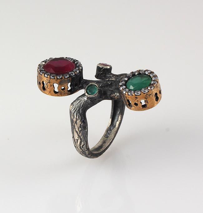 Natural Stone Cocktail Victorian Design Ring **|**|** 7.62g Natural Stone Cocktail Ring Victorian Design w/ 8MM Ruby & 6MM Emerald Beryl; stamp 925 ; MSRP: $100