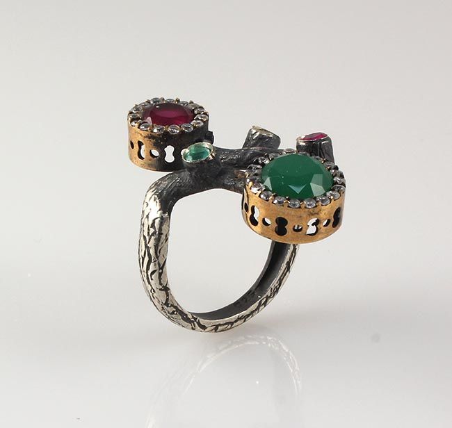 Natural Stone Cocktail Victorian Design Ring **|**|** 7.27g Natural Stone Cocktail Ring Victorian Design 6MM Ruby & 8MM Emerald Beryl; stamp 925 ; MSRP: $100