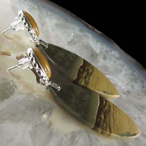 This is a pair of 925 silver Succor Creek Jasper bead earring * *Stone Properties *Name Succor Creek Jasper *Dimension 62x20x2 mm (2.441x0.787x0.079 inch ) *Weight 55 ct/ 11 g/ 0.388014 oz *Shape Flame Jasper *Locality USA - Oregon *Appearance opaque *Color Brown Gray yellowish bluish *Mohs Hardness 7 *Source Natural *Treatments None *Drilled YES diameter 2.5/36-3/36 inch *~~~~~~~~~(+) Each step of our Lapidary work is under tight quality control . With the best pattern-color combination possible in mind the initial cut was done by experienced lapidary ... The last-step diamond polishing makes the surface of each bead/cab mirror-like glossy that meet the highest standard possible. Finally only those met all quality requirements are selected.