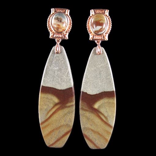 This is a pair of our own designer 925 silver Succor Creek Jasper earring *Other Stone used Succor Creek Jasper *Stone Properties *Name Succor Creek Jasper *Dimension 69x18x3 mm (2.717x0.709x0.118 inch ) *Weight 70 ct/ 14 g/ 0.493836 oz *Shape *Locality USA - Oregon *Appearance opaque *Color Brown Gray yellowish bluish *Mohs Hardness 7 *Source Natural *Treatments None *Drilled YES diameter 2.5/36-3/36 inch *~~~~~~~~~(+) Each step of our Lapidary work is under tight quality control . With the best pattern-color combination possible in mind the initial cut was done by experienced lapidary ... The last-step diamond polishing makes the surface of each bead/cab mirror-like glossy that meet the highest standard possible. Finally only those met all quality requirements are selected.