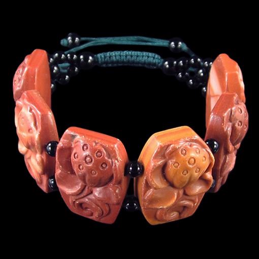 *Stone Name Red Malachite Lotus *Stone Overall Dimension for each bead 28x20x10 mm (1.102x0.787x0.394 inch ) *Weight 270 ct/ 54 g/ 1.904796 oz*Handcrafted knot chain;Other Stones used in this Bracelet Red Malachite;*Center Stone Properties *Locality unknown *Appearance opaque *Color red off-white band *Mohs Hardness 4.5 *Source Natural *Treatments None *Drilled YES diameter 2.5/36-3/36 inch *Other Names banded jasper~~~~~~~~~(+) Each step of our Lapidary work is under tight quality control . With the best pattern-color combination possible in mind the initial cut was done by experienced lapidary ... The last-step diamond polishing makes the surface of each bead/cab mirror-like glossy that meet the highest standard possible. Finally only those met all quality requirements are selected.
