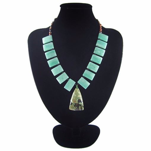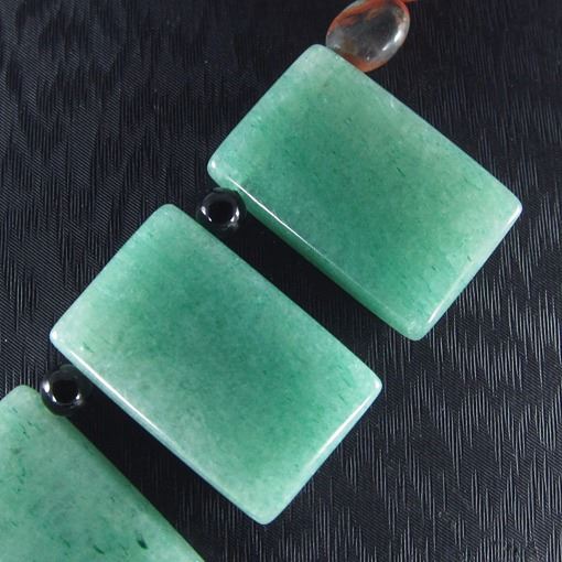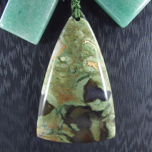 Stone Name Rhyolite *Stone Overall Dimension for each bead 51x31x6 mm (2.008x1.220x0.236 inch ) *Weight 495 ct/ 99 g/ 3.492126 ozOther Stones used in this Necklace Green Aventurine*Center Stone Properties *Locality Australia *Appearance opaque *Color green - yellow *Mohs Hardness 5 *Source Natural *Treatments None *Drilled YES diameter 2.5/36-3/36 inch *Other Names~~~~~~~~~(+) Each step of our Lapidary work is under tight quality control . With the best pattern-color combination possible in mind the initial cut was done by experienced lapidary ... The last-step diamond polishing makes the surface of each bead/cab mirror-like glossy that meet the highest standard possible. Finally only those met all quality requirements are selected.
