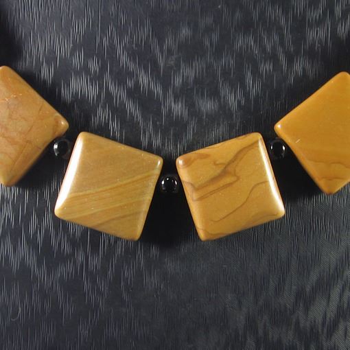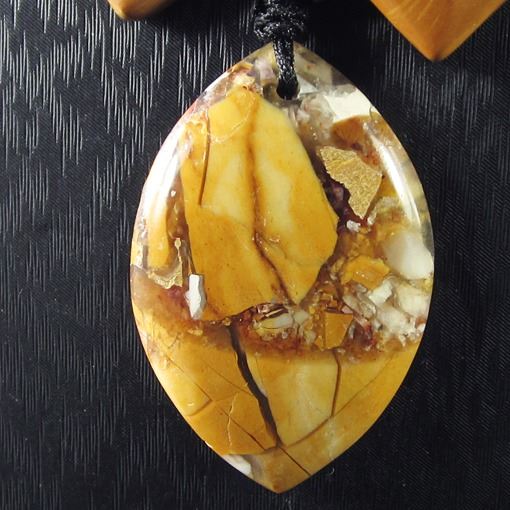 Stone Name Brecciated Mookaite *Stone Overall Dimension for each bead 37x25x6 mm (1.457x0.984x0.236 inch ) *Weight 340 ct/ 68 g/ 2.398632 ozOther Stones used in this Necklace Wood Picture Jasper*Center Stone Properties *Locality Australia *Appearance opaque to semi-transparent *Color Yellow Coffe Black *Mohs Hardness 7 *Source Natural *Treatments None * Drilled YES diameter 2.5/36-3/36 inch *Other~~~~~~~~~(+) Each step of our Lapidary work is under tight quality control . With the best pattern-color combination possible in mind the initial cut was done by experienced lapidary ... The last-step diamond polishing makes the surface of each bead/cab mirror-like glossy that meet the highest standard possible. Finally only those met all quality requirements are selected.