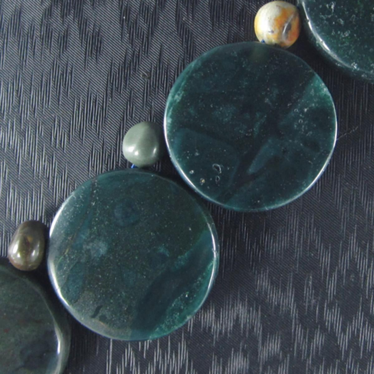 Necklace Size Ajutable 19-28 inch (if range given) *Stone Name Moss Agate *Stone Overall Dimension for each bead 48x29x6 mm (1.890x1.142x0.236 inch ) *Weight 370 ct/ 74 g/ 2.610276 ozOther Stones used in this Necklace Fancy Agate*Center Stone Properties *Locality India *Appearance transparent to semi-transparent *Color Red Green Yellow and others Green *Mohs Hardness 7 *Source Natural *Treatments None *Drilled YES diameter 2.5/36-3/36 inch *Other Names~~~~~~~~~(+) Each step of our Lapidary work is under tight quality control . With the best pattern-color combination possible in mind the initial cut was done by experienced lapidary ... The last-step diamond polishing makes the surface of each bead/cab mirror-like glossy that meet the highest standard possible. Finally only those met all quality requirements are selected.