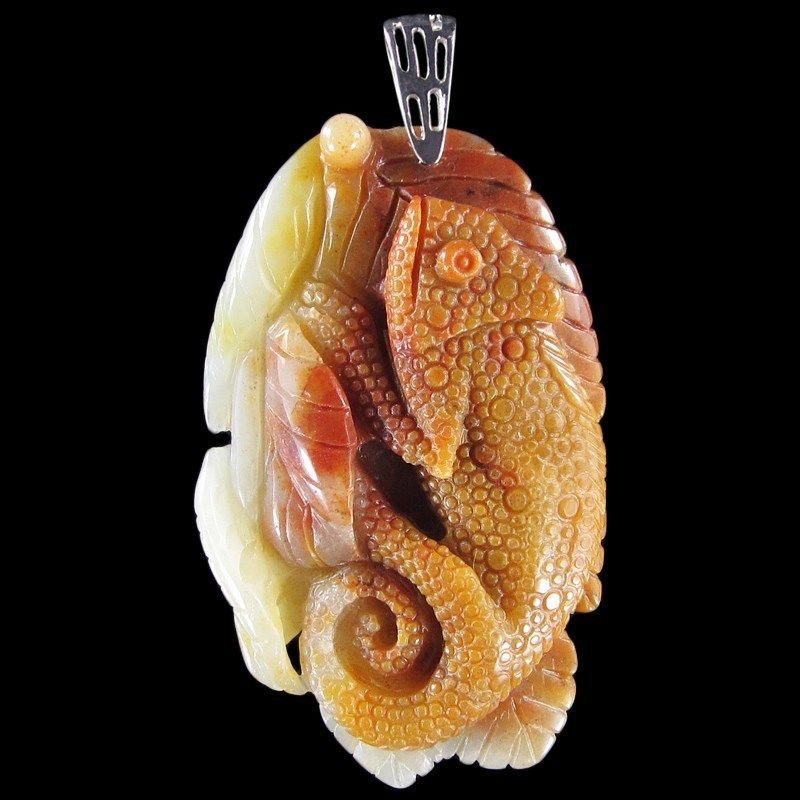 This is hand carved Chameleon Pendant *Stone Properties *Stone Name Multi-Color Amazonite *Overall Dimension 69x35x11 mm (2.717x1.378x0.433 inch )mm *Weight 150 ct/ 30 g/ 1.05822 oz *Mohs Hardness 7 *Source Natural *Treatments None *Drilled YES diameter 2.5/36-3/36 inch *Other Names*This Chameleon bead is handcarved out of one piece of gemstone Multi-Color Amazonite .The creative design of each item is based on the stone's natural color and pattern and it demands great craftmenship and patience to complete . This beauty is absolutely a unique center piece for your jewelry design. .