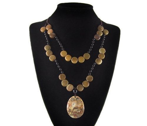 *Necklace length Adjustable 19.5-28.5 inch *Stone Name Agate *Stone Overall Dimension for each bead 47x37x5 mm (1.850x1.457x0.197 inch ) *Weight 405 carat*Center Stone Properties *Locality Mexico - Chihuahua *Appearance opaque *Color Yellow Red Brown Black White with extremely varied patterns *Mohs Hardness 7 *Source Natural *Treatments None *Drilled YES diameter 2.5/36-3/36 inch *~~~~~~~~~